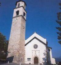 Già sede della pieve comprendente una decina di paesi,è menzionata nel 1128, fu riedificata agli inizi del XVI secolo e rimaneggiata nel secolo XVIII. La massiccia base del campanile che s' innalza, staccata dalla chiesa, sarebbe, secondo la tradizione, di origine romana, ma, più probabilmente, si tratta del basamento di una torre medievale.